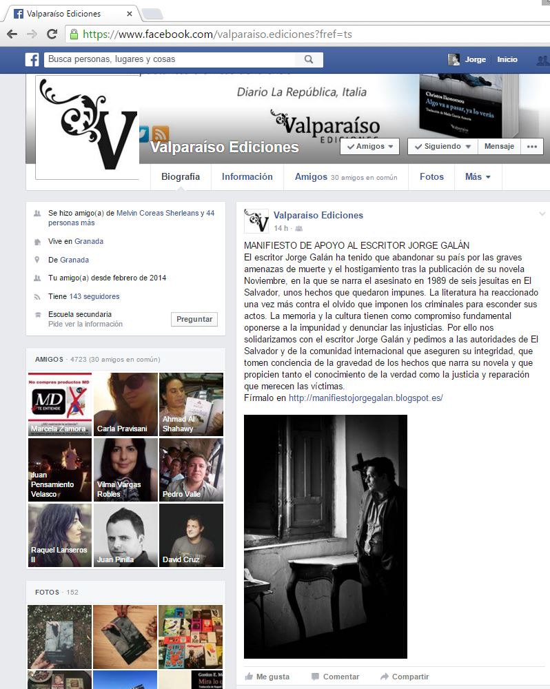 La página de apoyo a Jorge Galán fue creada por el sitio oficial de Valparaíso Ediciones en Facebook, editor de la novela previa a Noviembre, publicada por Planeta, del autor salvadoreño.