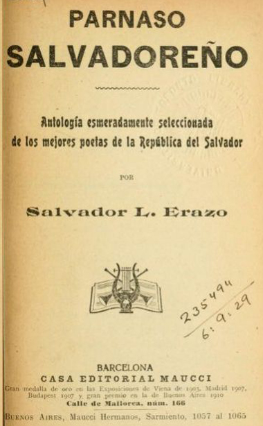 A continuación comparto el enlace a la antología de poesía salvadoreña del final del siglo XIX Parnaso Salvadoreño. Es de difícil obtención, pero se encuentra ahora disponible para consultarla en línea en el sitio archive.org. Y luego comparto una breve nota biográfica del antólogo, Salvador L. Erazo, pues es muy poco conocido. Dado que el libro fue publicado sin fecha, historiógrafos literarios habían fijado 1916 como año de publicación del libro, pero logré obtener los catálogos de la Editorial Maucci y he logrado determinar que en realidad el Parnaso Salvadoreño se publicó en 1906.